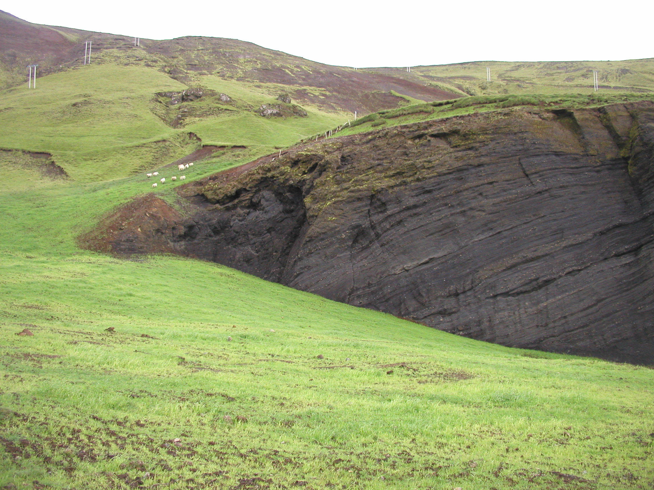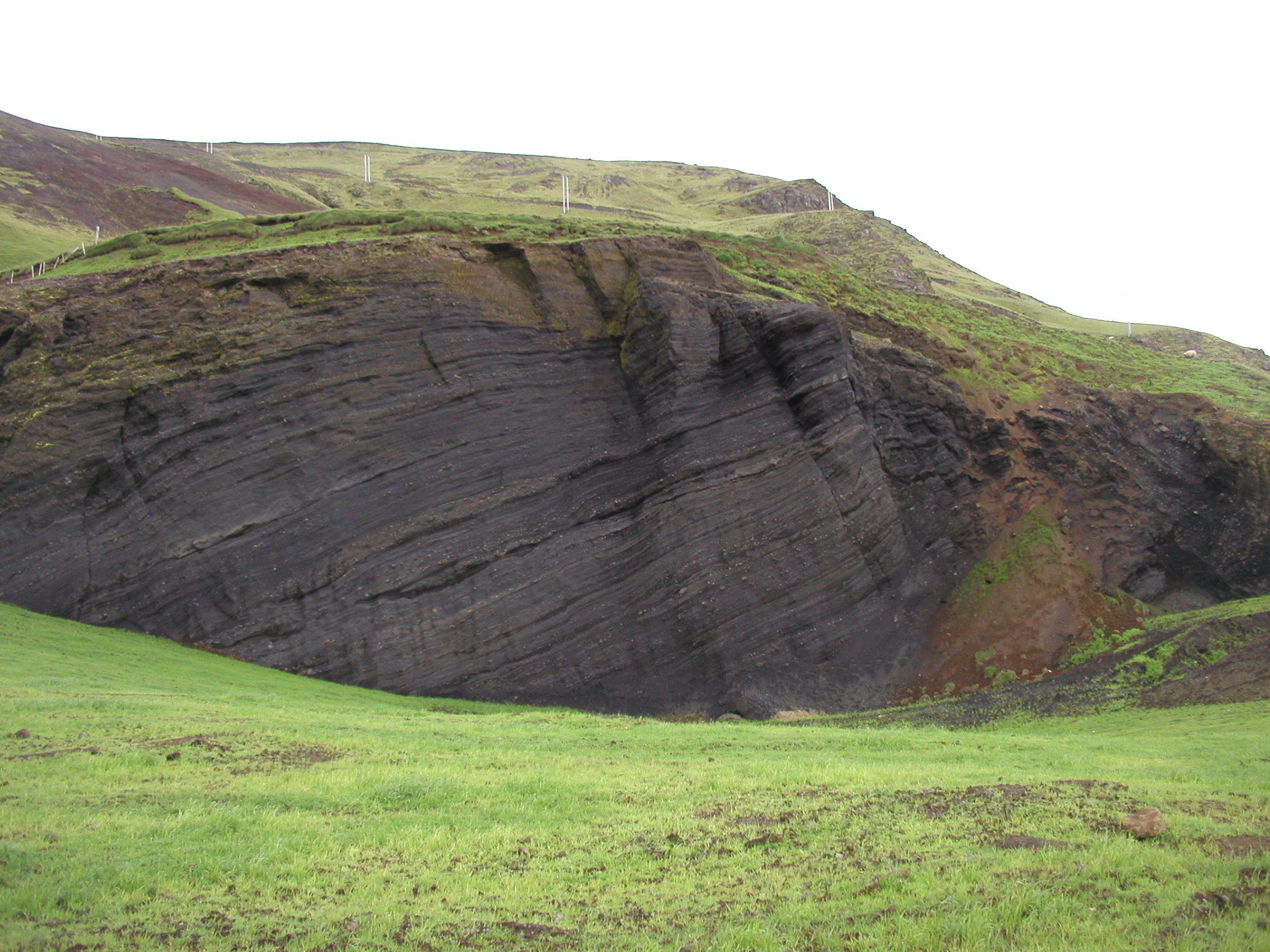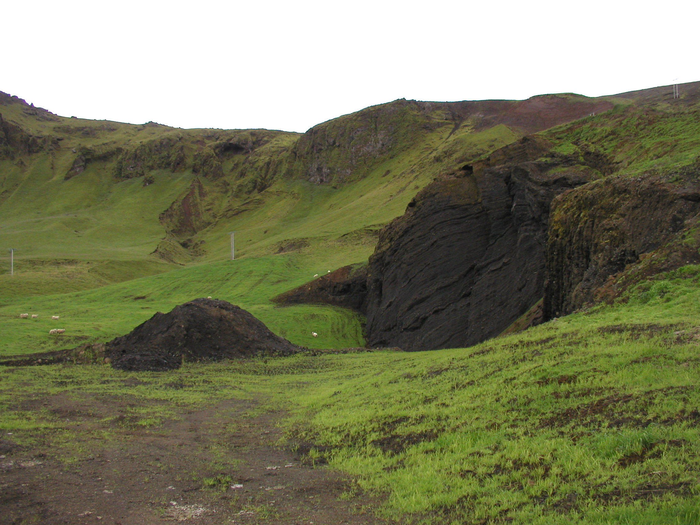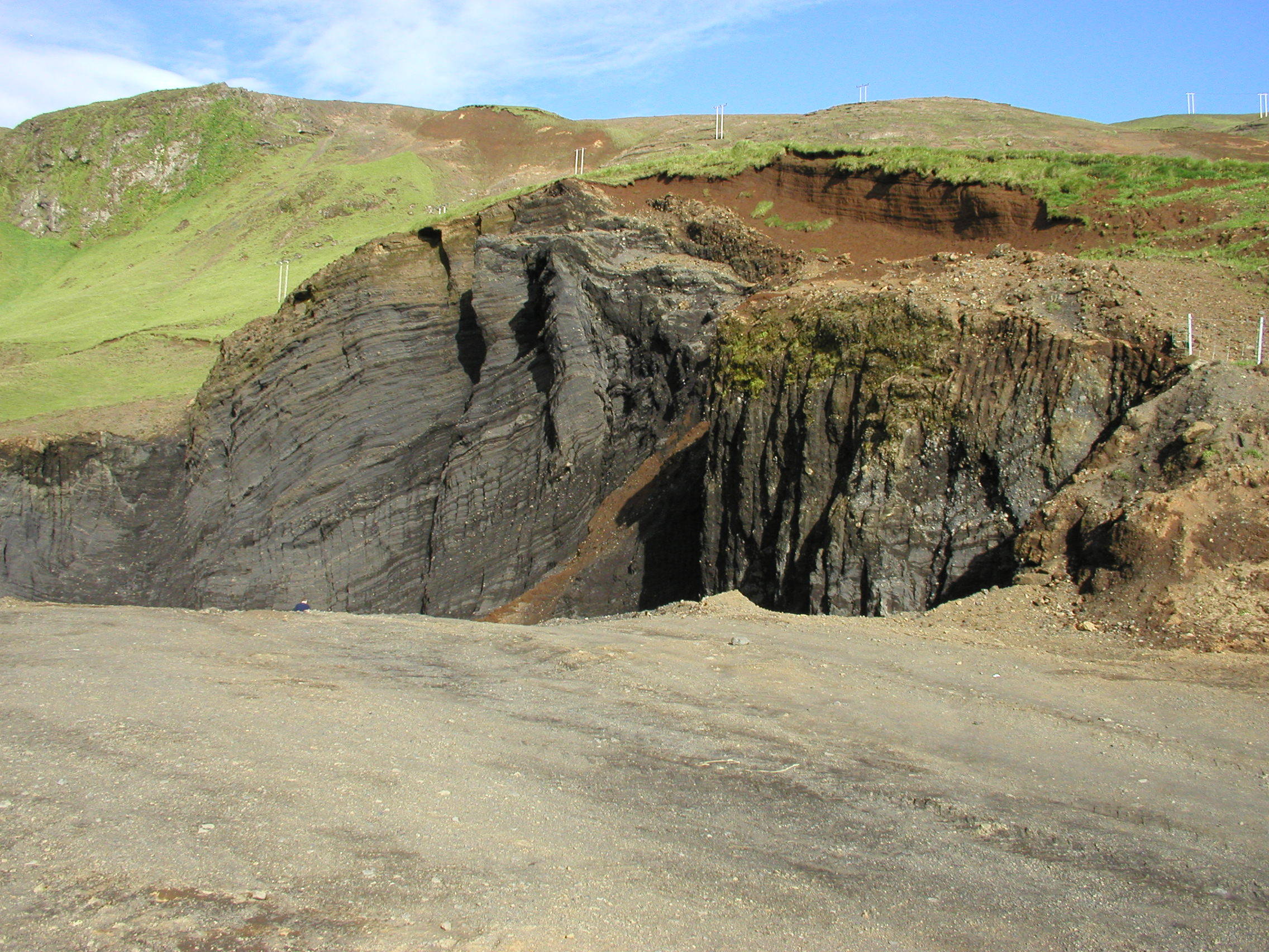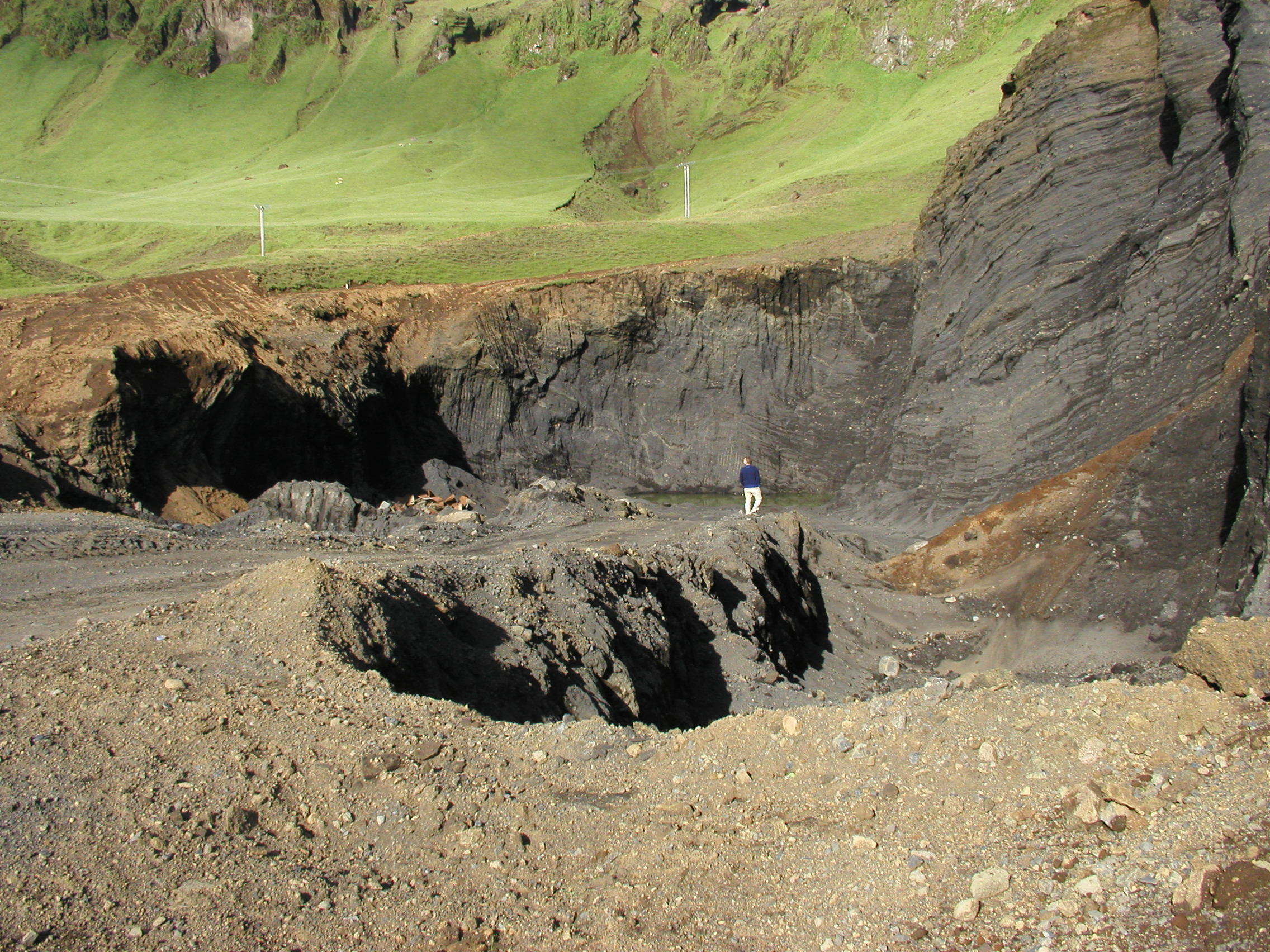 Við frágang námunnar var óhreyfður svartur móbergsveggur sem skorinn hafði verið við vinnslu námunnar látinn halda sér. (Ljósm. GBj)